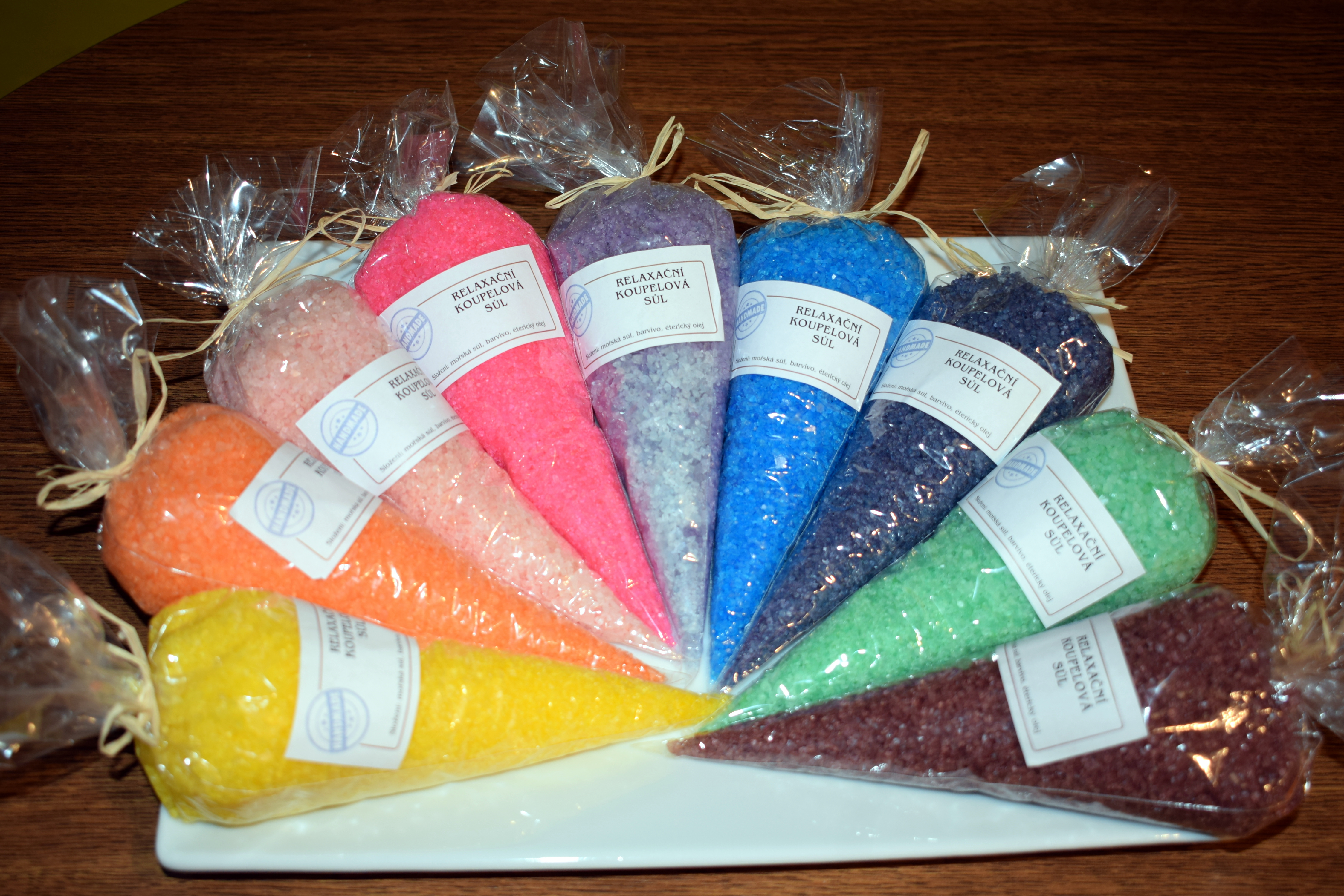 Sůl je barvená a voňavá. Možnost výběru barvy a vůně. Hmotnost 250g. Cena 40Kč.